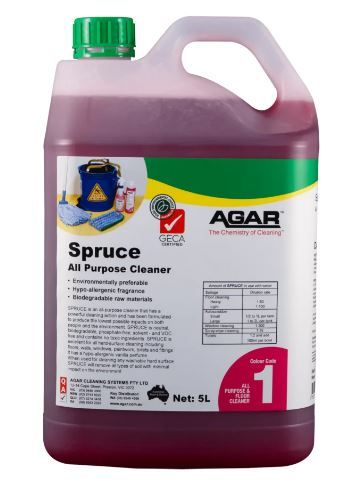 Spruce is an all-purpose cleaner that rapidly penetrates and removes light to medium soil loads from all washable hard surfaces. It is a water-based detergent that has been formulated to produce the lowest possible impacts on both people and the environment, whilst facilitating highly effective and productive cleaning.