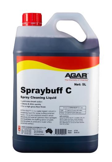 SPRAYBUFF C is a solvent-containing liquid for spray buffing polished floors. It is a non-residual solutions which dissolves dirt and facilitates the buffing action of pads and brushes to produce a super shiny polished surface.